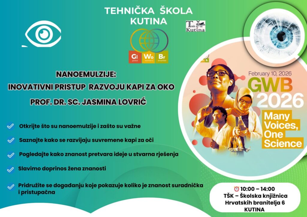 Tehnička škola Kutina je 10.2. ponovo dio događanja Međunarodni ženski kemijski doručak. Već sedmu godinu dio smo  zajednice koja promovira znanost, znanstveni pogled na svijet  te posebno ističe ženski doprinos znanosti i industriji. Ove godine u goste nam dolazi prof. dr. sc. Jasmina Lovrić koja je zaposlena  kao redovita profesorica na Zavodu za farmaceutsku tehnologiju Farmaceutsko-biokemijskog fakulteta Sveučilišta u Zagrebu. Područje njezina znanstveno-istraživačkog interesa obuhvaća razvoj inovativnih farmaceutskih oblika te razvoj i primjenu inovativnih metoda biofarmaceutske karakterizacije. Posljednjih godina njezina su istraživanja usmjerena na razvoj oftalmičkih nanoemulzija. U okviru zajedničkog projekta s tvrtkom Jadran-Galenski laboratorij d.d. sudjeluje u industrijskom razvoju inovativne farmaceutske platforme za formulaciju teško topljivih djelatnih tvari namijenjenih liječenju bolesti suhog oka.